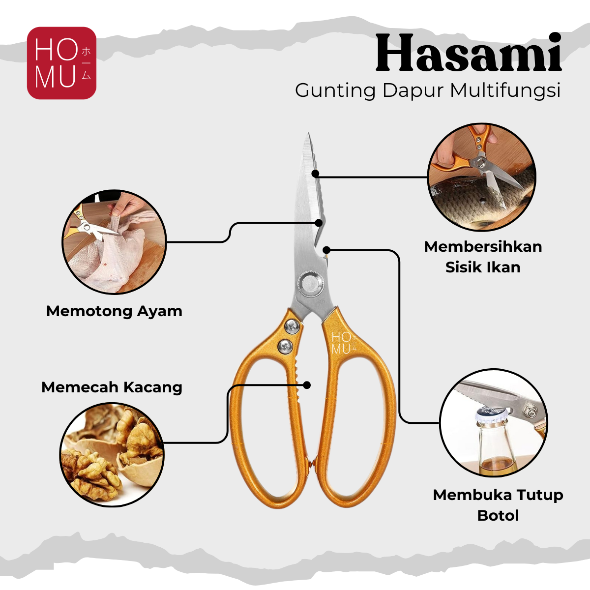 – Multifungsi : Tidak hanya mudah memotong kardus, benang, makanan, daging, sayuran, ayam, unggas, ikan, bumbu dapur, makanan laut, tetapi juga untuk